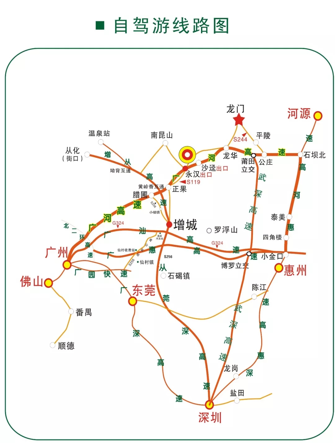 华南快速干线(龙洞春岗立交)→广河高速(往河源方向)→永汉(下高速第一个红绿灯,右转往龙门方向8公里)→温泉大观园