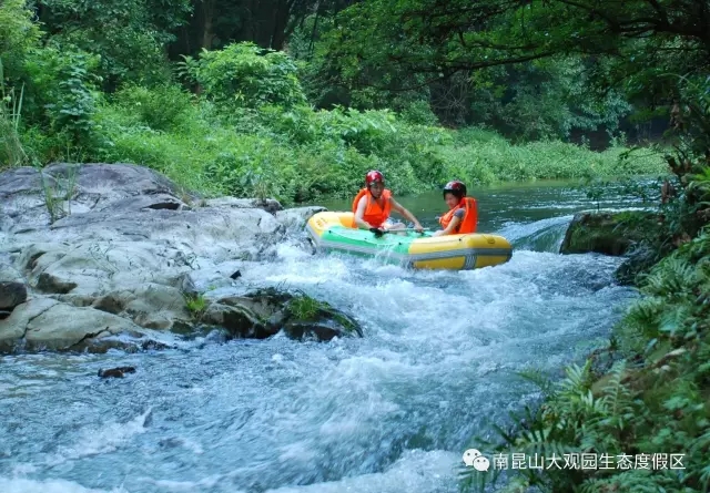 昆山峡全程漂全长7公里左右,漂流时长约两小时,半程漂全长3.5公里左右,漂流时长约一小时。整个河道隐蔽在葱郁森林中,河道巨石险滩,水清见底,漂流艇在溪涧飞流中时而俯冲而下,时而轻舟荡漾,沿途饱览河光山色,尽情享受醉人的峡谷风景。